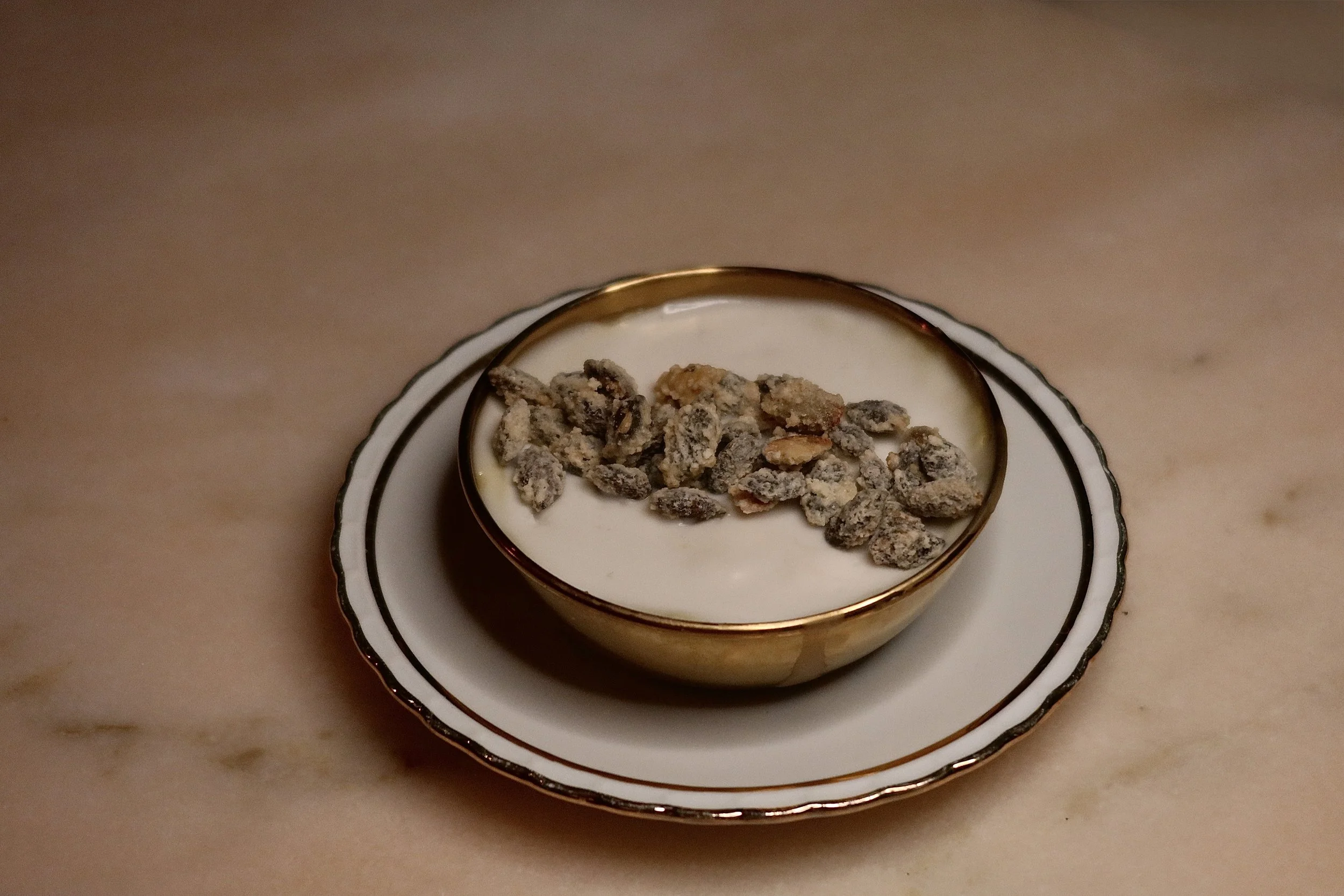 Sobre puré de coliflor trufado, mantequilla noisette y avellanas.